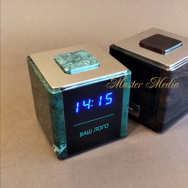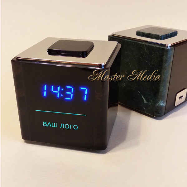 Светодиодные часы "КУБ" выполнены из обсидиана и мрамора. Отделка из латуни покрыта никелем. Интуитивная настройка часов осуществляется одной сенсорной клавишей, расположенной в верхней части корпуса и выполненной тоже из камня. Часы упакованы в подарочный футляр из экокожи. В комплект входят: адаптер питания, usb кабель в декоративной нейлоновой оплетке. Габариты часов: 70х70х70 мм.