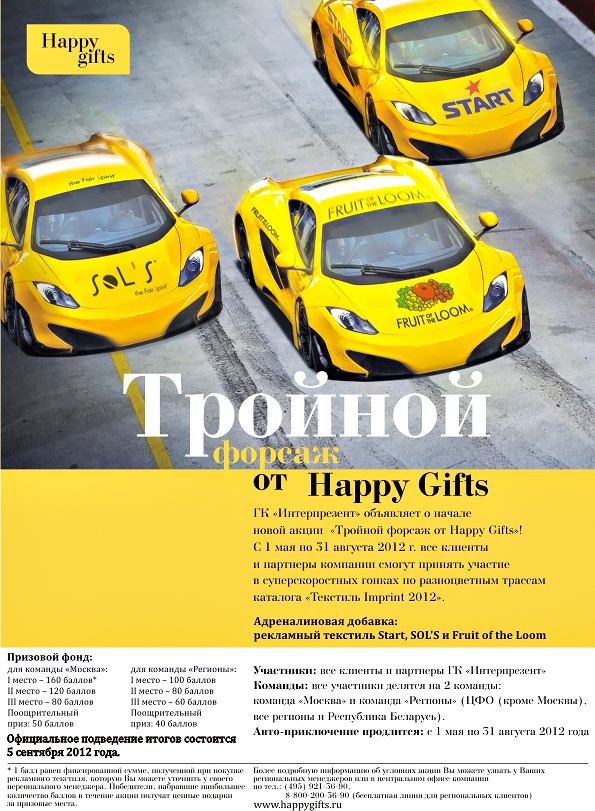 Не смотря на то, что «Тройной форсаж от Happy Gifts», стартовавший 1 мая 2012г., подходит к финишу, у профессиональных участников рекламного рынка еще есть возможность пройти регистрацию на официальном сайте компании и включиться в борьбу за ценные призы.
