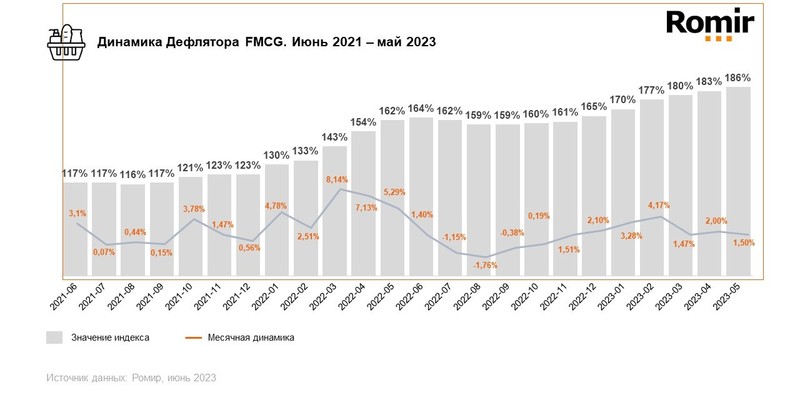 Исследовательский холдинг «Ромир» продолжает проводить расчёты статистического индекса-дефлятора, отражающего фактические изменения общего уровня цен на товары в категории FMCG.