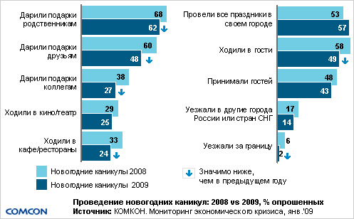 Результаты опроса также показывают, что в 2009 г. значимо меньшее число россиян дарили подарки родственникам, друзьям и коллегам, отмечали праздник в кафе или ресторане, а также уезжали за границу.
