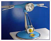 Если вы точно знаете, что ваш знакомый заядлый мотоциклист, а преподнести ему в подарок мотоцикл вы не в состоянии, то удачным вариантом для вас может стать настольная лампа Lamponi, выполненная в виде руля от мотоцикла. Как сообщает gizmodo.ru, стоит такая лампа приблизительно £800. Изготавливаются гаджеты по индивидуальному заказу из фар старых мотоциклов Vespa.