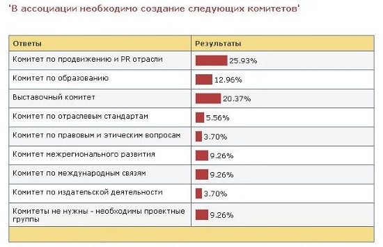 По-видимому, самыми необходимыми являются Комитет по продвижению и PR отрасли и Выставочный комитет. И задачи, в целом, перекликаются - посетители нашего портала считают, что отрасли срочно необходимы PR, единая выставка и проведение полномасштабного исследования рынка.